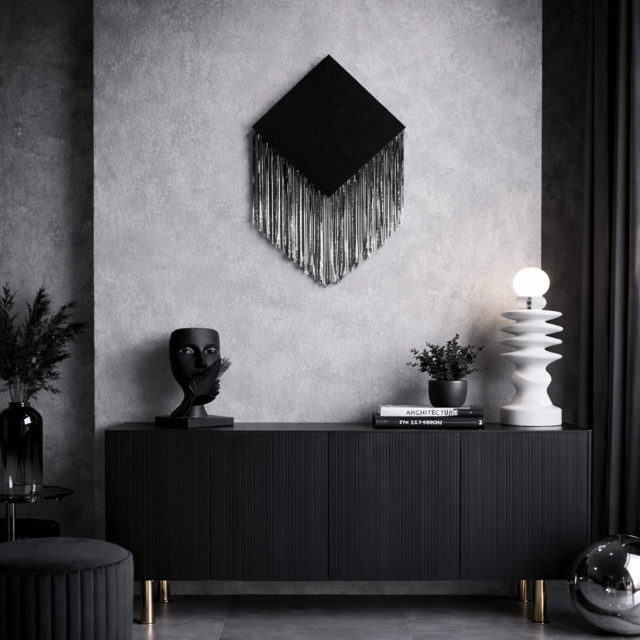 Lustro z frędzlami w kolorze czarnym to wyjątkowa dekoracja, która wyróżnia się minimalistycznym, a zarazem artystycznym charakterem. Jego geometryczny kształt, przypominający romb, połączony z delikatnymi, zwisającymi frędzlami, tworzy efekt nieoczywistego luksusu i elegancji.