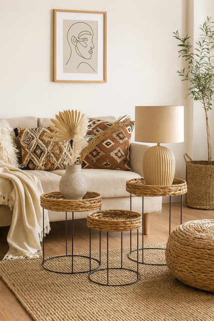 Zestaw stolików boho z hiacyntu wodnego to połączenie funkcjonalności i estetyki, które ożywi każde wnętrze. Każdy z trzech stolików wyróżnia się starannie plecionym, naturalnym materiałem, który dodaje im charakteru. Metalowe nóżki w eleganckim, czarnym kolorze tworzą kontrast z ciepłymi tonami plecionki, co sprawia, że całość prezentuje się niezwykle nowocześnie i stylowo. Te stoliki to efektowne meble, ale również dekoracyjne akcenty, które wprowadzą do przestrzeni przytulną atmosferę.