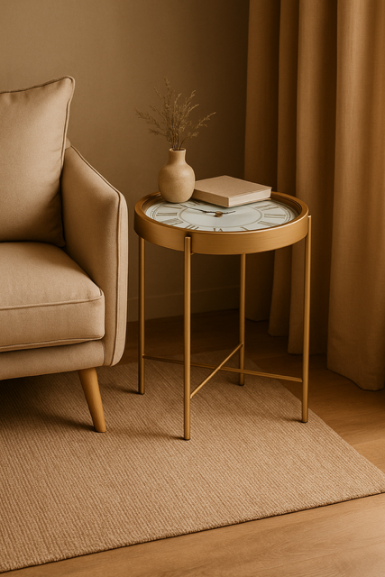 Stolik złoty z zegarem to doskonały wybór dla osób, które cenią sobie funkcjonalność, ale i estetykę. Sprawdzi się w wnętrzach w stylu glamour, gdzie eleganckie akcenty są kluczowe. Wniesie powiew luksusu do nowoczesnych mieszkań, w których liczy się każdy detal. Może również stać się ciekawym akcentem w loftowych przestrzeniach, gdzie metalowe wykończenia i geometryczne kształty są na porządku dziennym. Jego uniwersalny design sprawia, że jest to mebel, który wkomponuje się w wiele stylów, podkreślając indywidualny charakter każdego wnętrza.